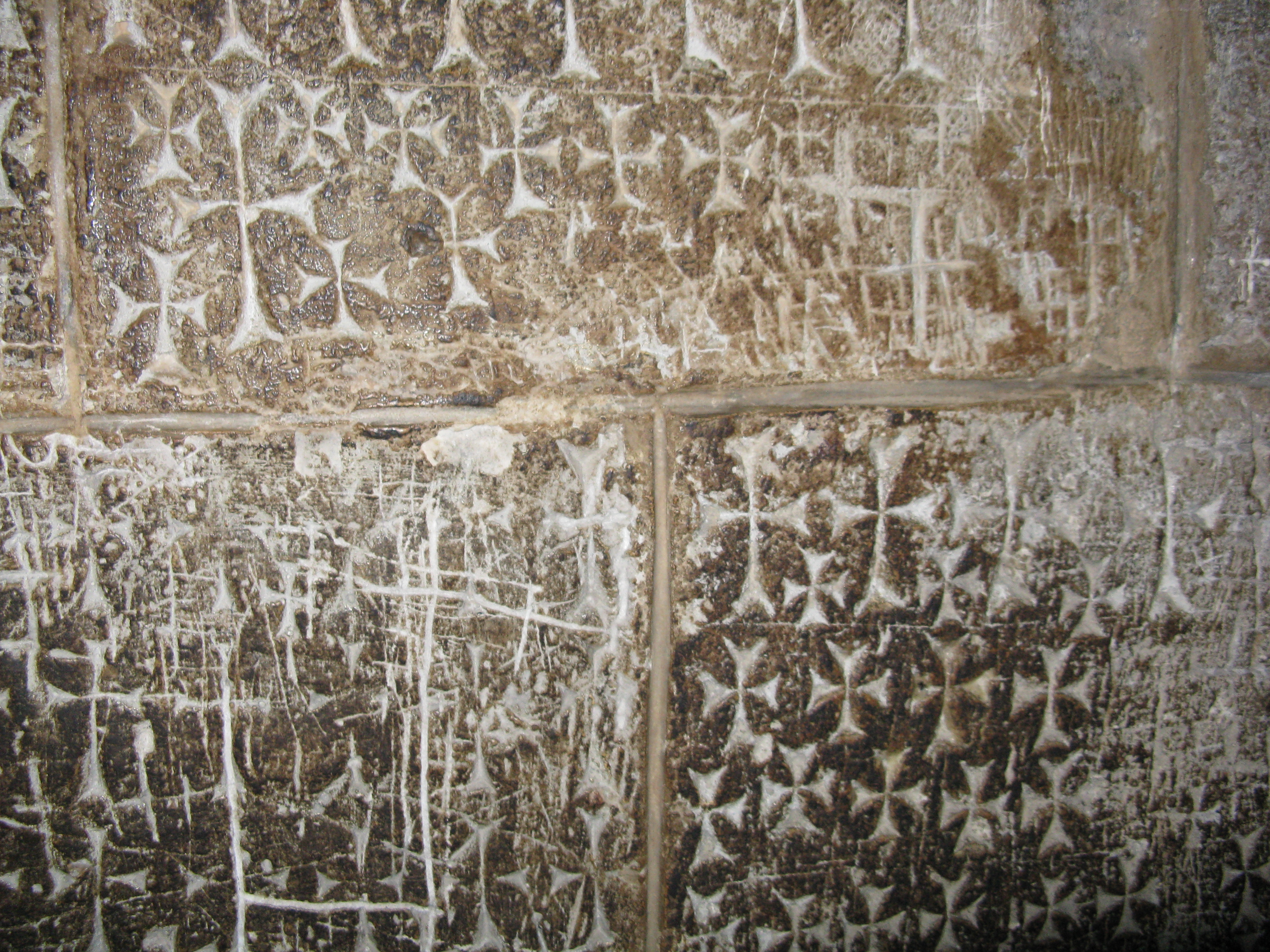 It is not surprising that crosses are a common sight in Jerusalem. Not only do they decorate churches, but tourists as far back as the Crusaders have scratched them on the walls. Smaller wooden and metal ones by the thousands are on sale in shops. There are even a large number of full-sized wooden crosses that can be found leaning against the stone walls that line the Way of the Cross, the Via Dolorosa.