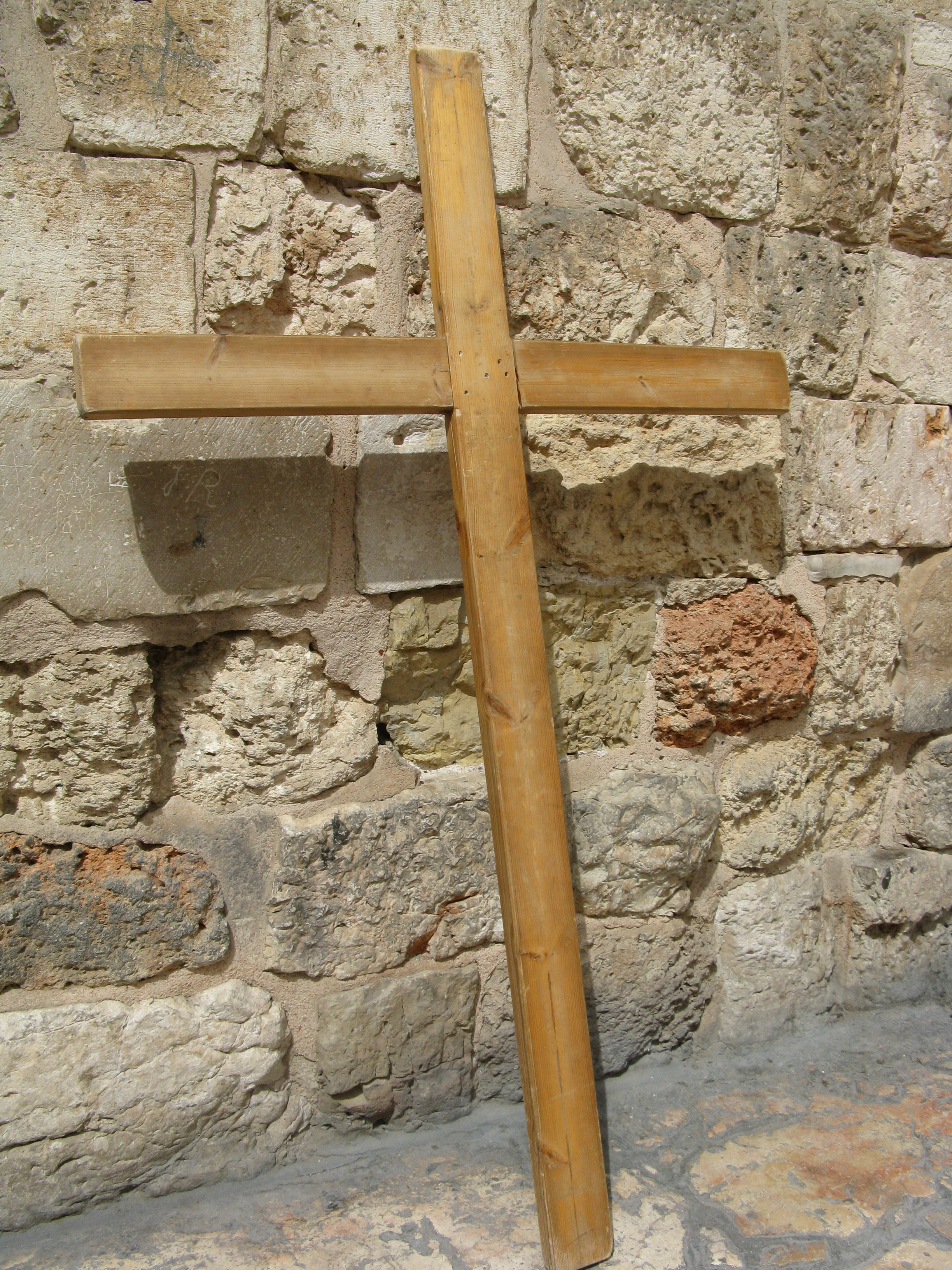 In the Church of the Holy Sepulchre, there is a stairway just to the right of the main door. At the top of those stairs is a divided chapel, which is where the crucifixion has traditionally been commemorated. The Orthodox side is resplendent with a life-sized icon of the crucified Christ adorned with gold leaf. Burning in front of it are racks of blazing candles. There is also a small altar. At any time people may be seen waiting to the side of it. One by one, they kneel and crawl under the altar, and stay there for a few moments.